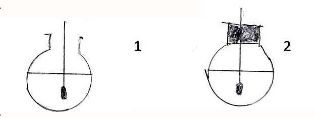 2) Dans un ballon en verre, ébullition prolongée à 100° : la vapeur d’eau en se dégageant, entraîne la totalité de l’air contenu. Fermeture rapide par un bouchon traversé d’un thermomètre. Il ne reste alors qu’à verser de l’eau froide sur le ballon pour provoquer une nouvelle ébullition très visible, la condensation de la vapeur ambiante provoque une dépression, diminuant ainsi le point d’ébullition
