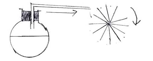 Faisons bouillir de l’eau dans un récipient bouché, traversé par un petit tube. La pression provoquée par la vapeur peut faire actionner et tourner une petite roue à ailettes placée tangentiellement à l’arrivée de vapeur.