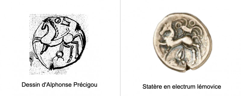 Le statère gaulois est une monnaie d'environ 20 mm de diamètre, pesant autour de 7 gr. C'est l'imitation assez lointaine d'un modèle grec déjà ancien, le statère de Philippe II de Macédoine. Le potin jaune dont parle Précigou est en fait de l'électrum, alliage naturel d'or et d'argent, souvent mélangé avec du cuivre. Les Lémovices ont beaucoup utilisé cet alliage que leur fournissaient les mines d'or qu'ils exploitaient. Le dessin de 1890 figure une monnaie légèrement décentrée vers le haut, ce qui rend l'identification complète difficile. Le statère figuré en photo permet de reconnaître, au-dessus du cheval, une grue (oiseau) dont le cou est entouré de deux annelets pointés.