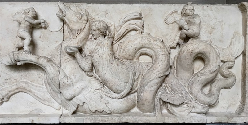 Ce dessin n'a pas été publié. L'information sur le bassin d'une fontaine est intéressante. La divergence sur le matériau est de peu d'importance, mais celle sur le sujet est plus troublante et n'apporte aucun détail : lions, ou tritons ?. Ce type de décor peut-être d'inspiration hellénistique. Le cortège de divinités marines est un motif funéraire de prédilection dans la société romaine durant le haut-empire, mais il peut aussi apparaître dans des temples ou des thermes. L'enfant avec les lions serait plus un thème dionysiaque.