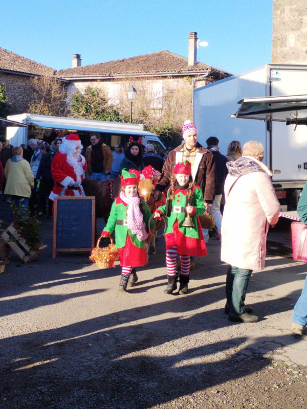 L’ambiance de Noël était joliment recréée avec l’arrivée du père Noël, escorté par deux fringants poneys parés de quelques décorations de fête et chargés de cadeaux et de paniers garnis de bonbons. Il était très gentil ce père Noël ! et tout le monde se pressait pour prendre la fameuse photo souvenir. Les deux sages lutins qui l’accompagnaient, étaient très occupés à la distribution des bonbons aux enfants sages. Un bon moment de convivialité très apprécié non seulement des petits mais aussi des grands.