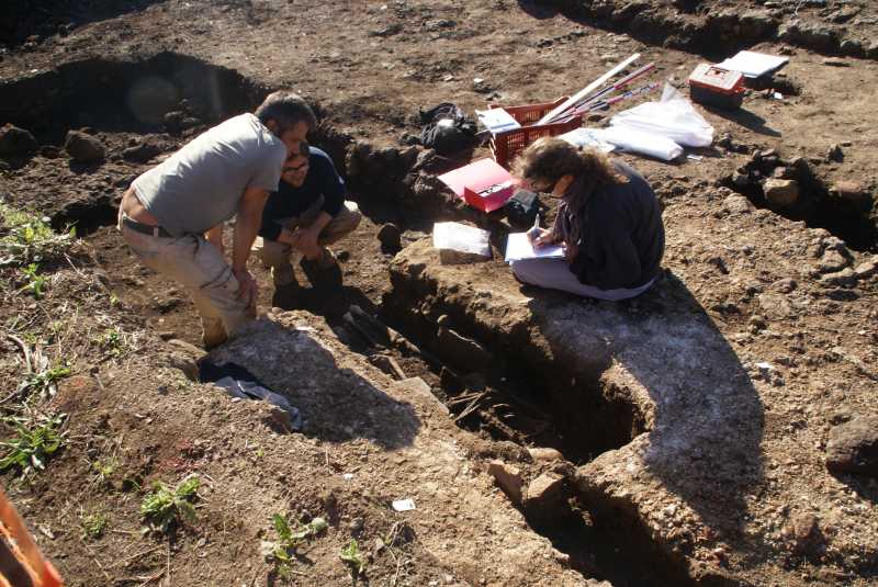 - Une phase augustéenne caractérisée par des structures (petites fosses ou fossés, trous de poteau) creusées dans la brèche puis le paléosol est décaissé et remplacé par un épais remblai noir sur l’ensemble des 1000 m². Ce dernier servira à installer des sols délimités par des solins ainsi qu’une aire de travail à vocation métallurgique (forges). Ce dernier point est intéressant pour la genèse de l’agglomération et les activités dont l‘artisanat.
