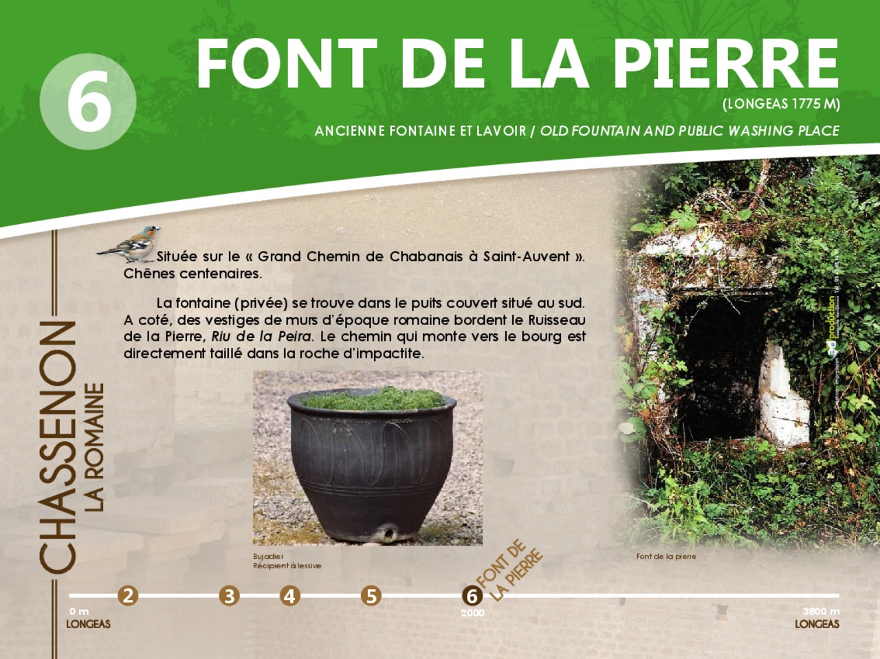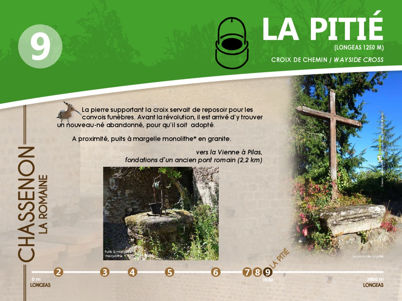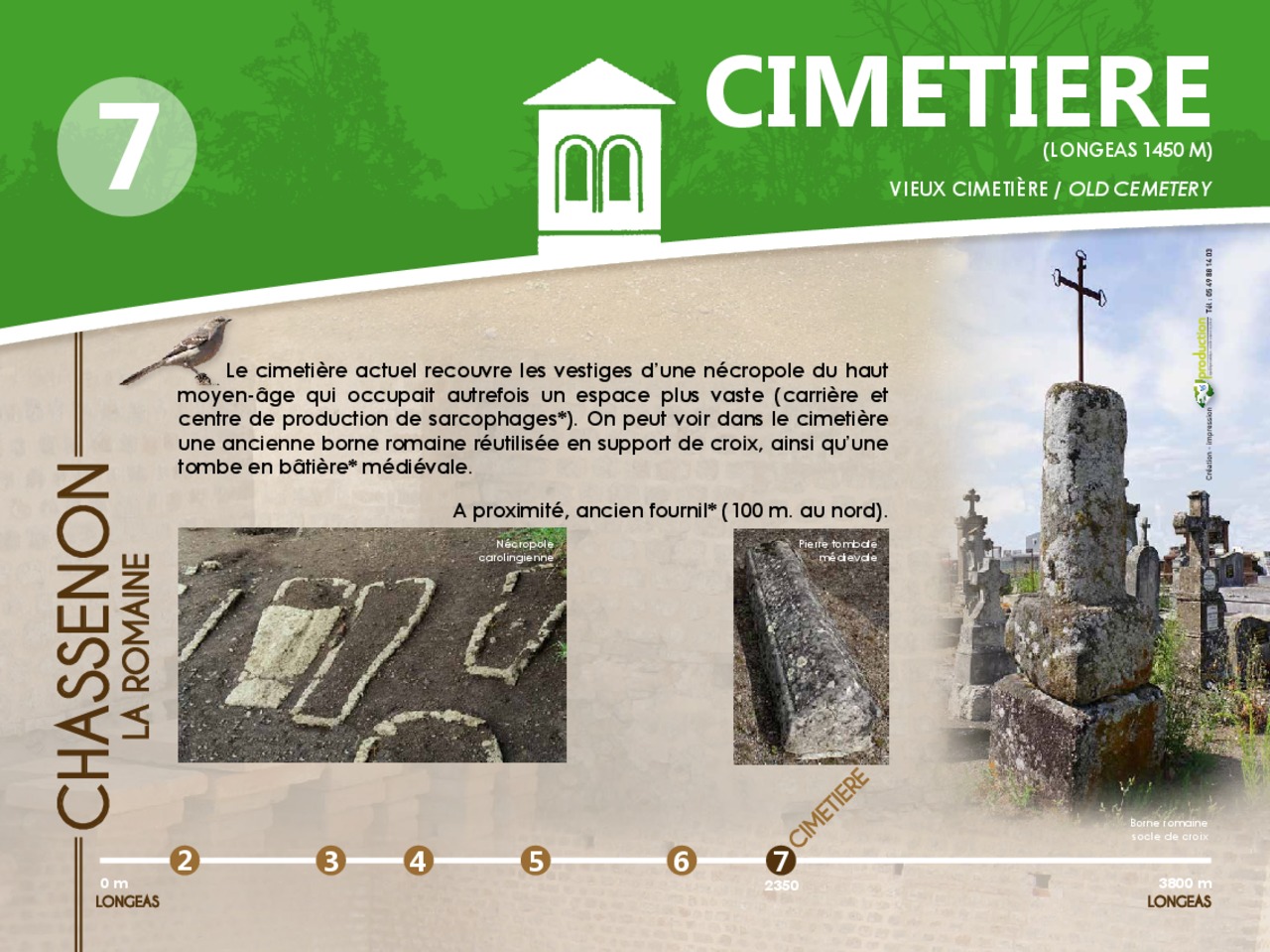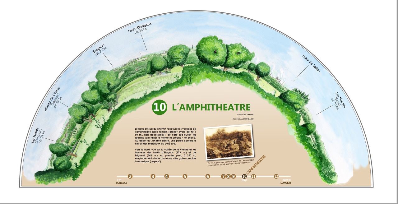 En images le panneau de départ et les 12 pupitres à découvrir en parcourant le chemin d'interprétaion de Chassenon la Romaine.