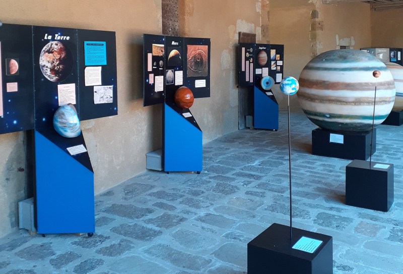 Les flamboyantes colonnes torses du portique de la galerie nord du château de Rochechouart servaient d'écrin à l'exposition pédagogique et très esthétique des planètes où Jupiter occupait la première place. |