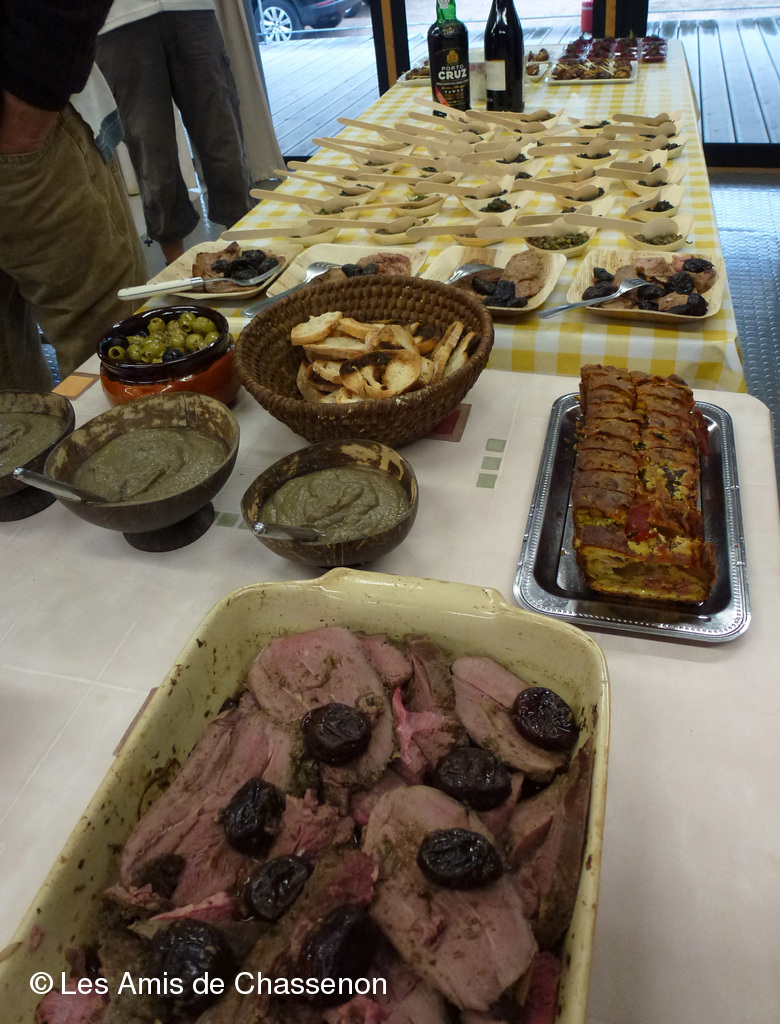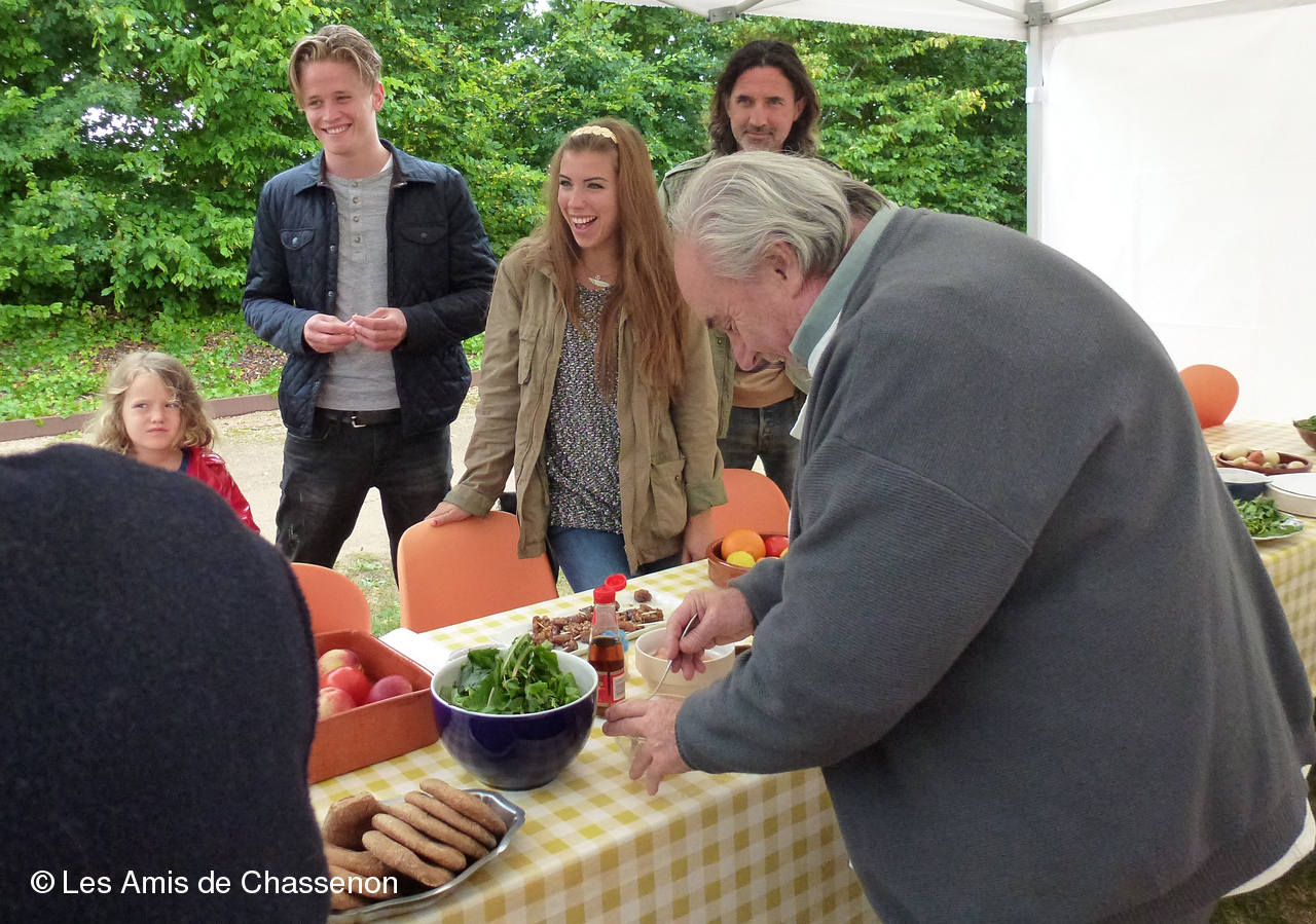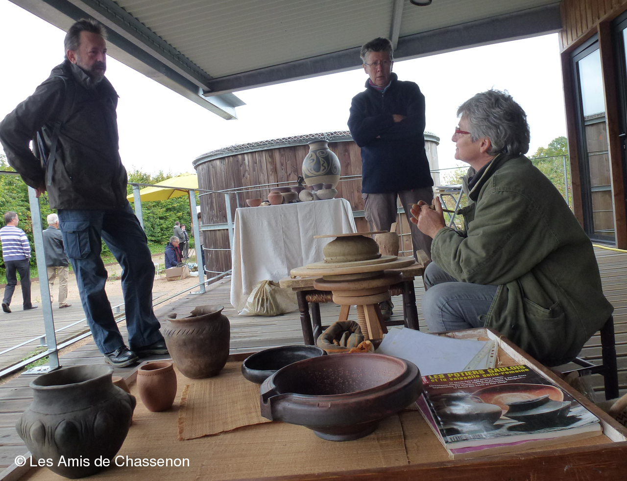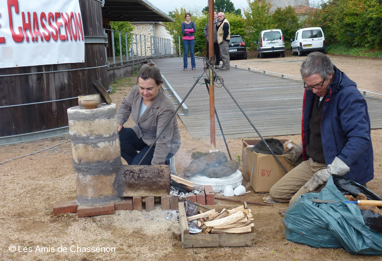La journée des Amis de Chassenon 2013 était placée sous le signe de la cuisine Romaine et nombreux sont celles et ceux qui ont fait preuve de leur compétence dans ce domaine, tous ceux qui ont dégusté les plats préparés peuvent en témoigner. Les cieux ne furent guère cléments en ce dimanche d'août, la pluie présente tout au long de la journée ne permit pas aux visiteurs de venir partager ces goûts surgis du lointain passé . Et pourtant de plus, Jacques Marchand avait installé son four de cuisson de céramique et malgré les trombes d'eau il réussit avec succès à réaliser un cycle de cuisson complet. Geneviève Devautour s'était mise à l'abri sous l'auvent des salles de réunion pour montrer aux visiteurs la subtilité de fabrication des pièces en poterie. Dany Potel a attendu en vain les enfants à qui il voulait faire découvrir les goûts des plantes romaines, mais il a réussi tout de même à découvrir la Reine du Parc de cette pluvieuse journée, elle était charmante. Seule Mélanie Gaignerot ne fut pas gênée par le déluge, elle avait programmé une conférence sur la cuisine romaine antique et elle fit salle comble!