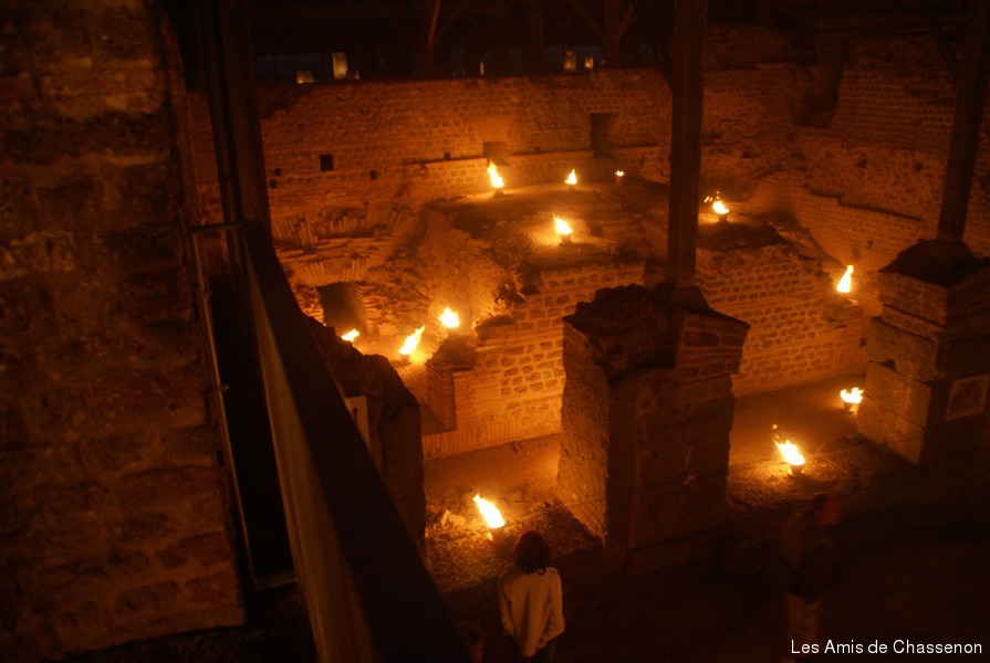 Troisième incendie après 2000 ans! … en fait une belle mise en valeur nocturne des Thermes par la Compagnie Carabosse. Photos J.Claude Barthout