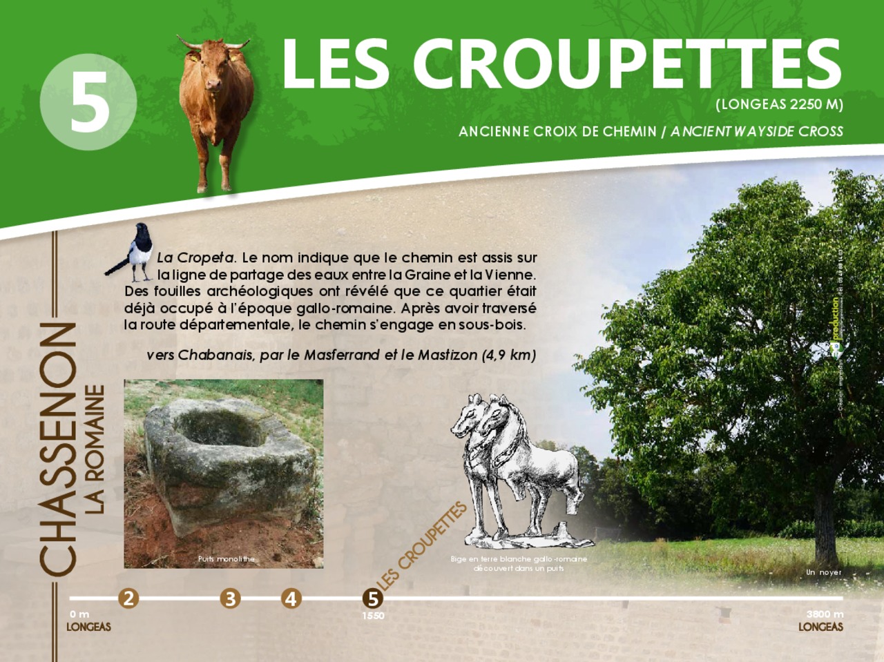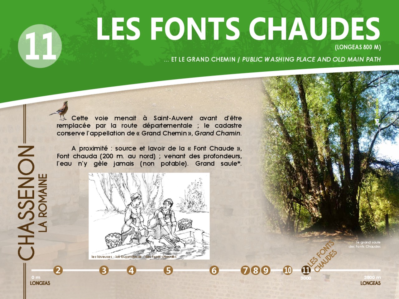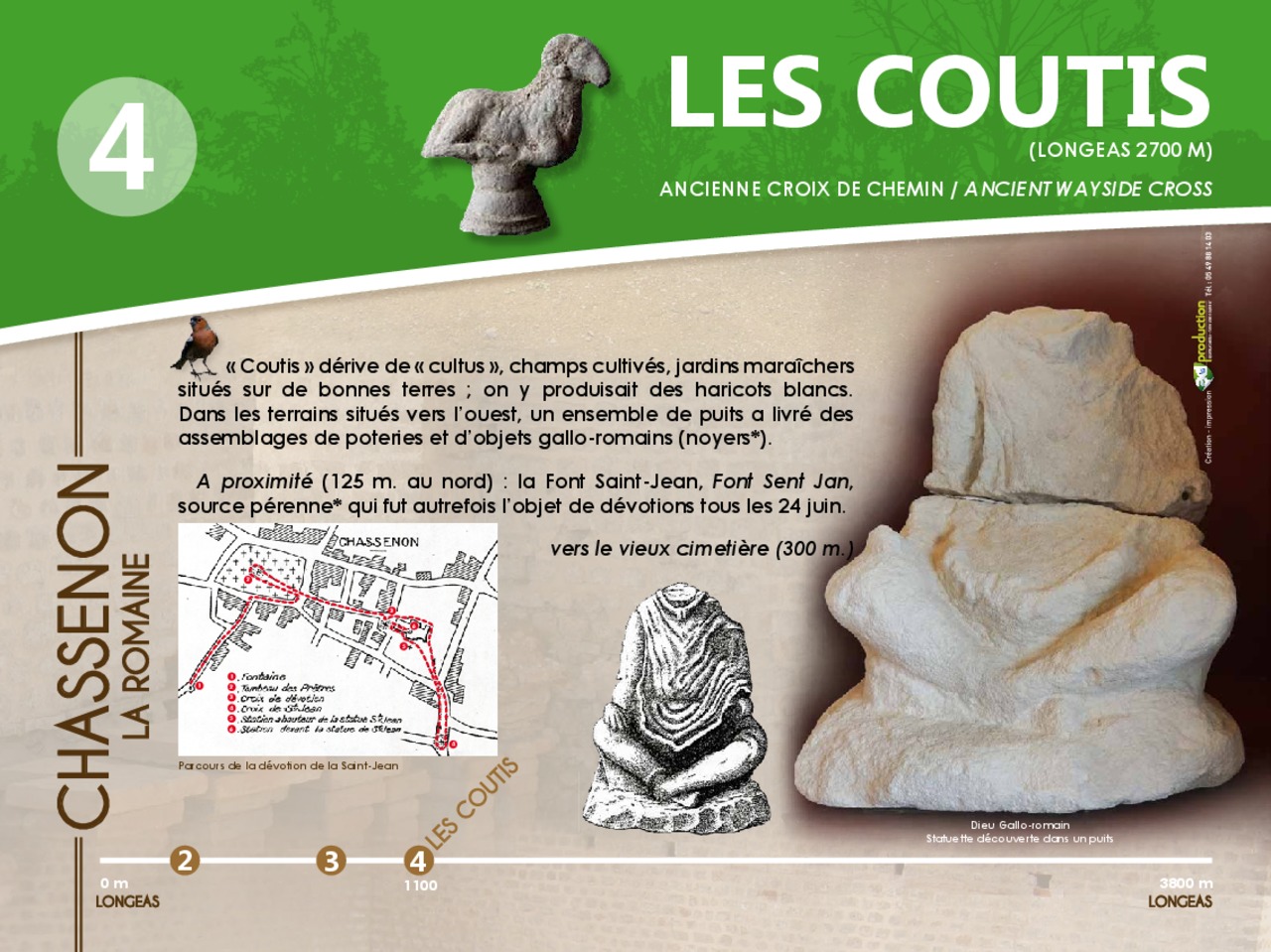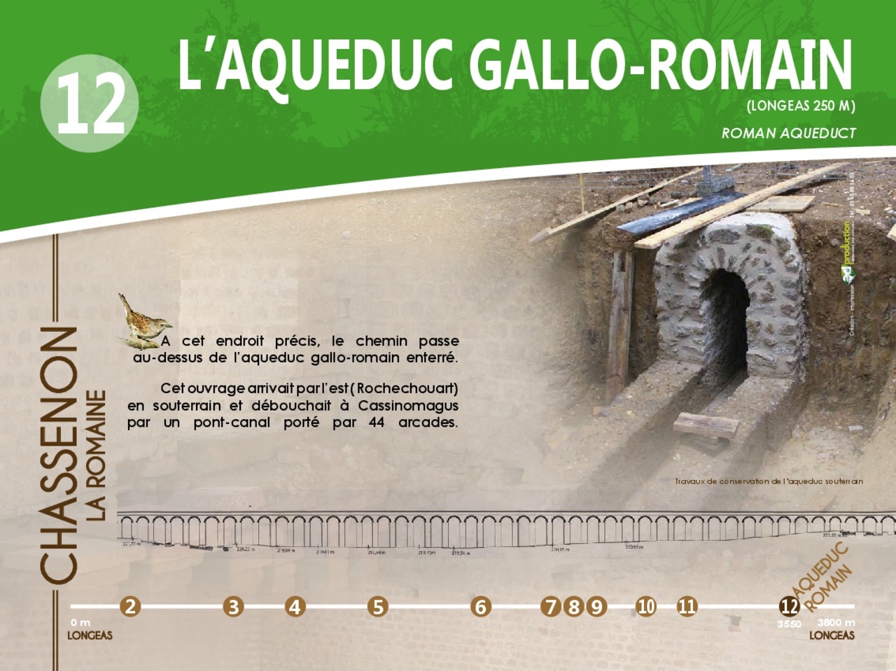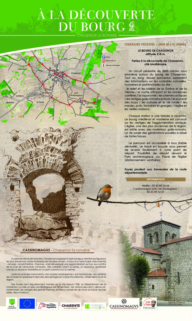 En images le panneau de départ et les 12 pupitres à découvrir en parcourant le chemin d'interprétaion de Chassenon la Romaine.